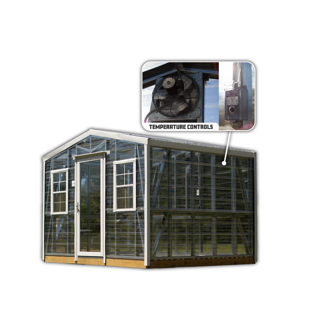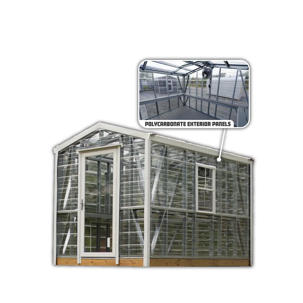 Our Greenhouse series is designed for durability and functionality, featuring strong steel framing to ensure lasting support. The Trex composite flooring and shelving offer moisture-resistant, eco-friendly surfaces for plants and supplies, while remaining easy to clean and maintain. Equipped with a 16” ventilation fan, these greenhouses provide optimal airflow to create the ideal growing environment. Combining sturdy construction with practical features, the Greenhouse series is perfect for any gardener.